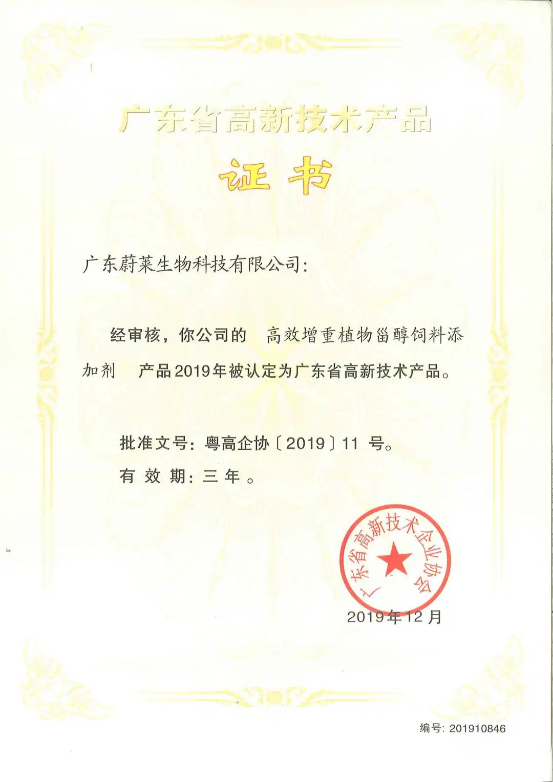 蔚萊1號是廣東蔚萊生物科技有限公司研發(fā)團(tuán)隊(duì)經(jīng)多年創(chuàng)新研發(fā)的一種功能型畜禽飼料添加劑,主要應(yīng)用范圍為畜牧養(yǎng)殖生產(chǎn)中。多年來,公司堅(jiān)持自主創(chuàng)新和產(chǎn)學(xué)研合作,不斷開發(fā)新產(chǎn)品以及產(chǎn)品的試驗(yàn)研究,這些科研成果為蔚萊順利獲得高新技術(shù)產(chǎn)品提供了有力的技術(shù)支持,通過此次高新技術(shù)產(chǎn)品評定,代表著公司產(chǎn)品“蔚萊1號”獲得業(yè)界的高度認(rèn)可,對提高產(chǎn)品的核心競爭力具有十分重要的意義。