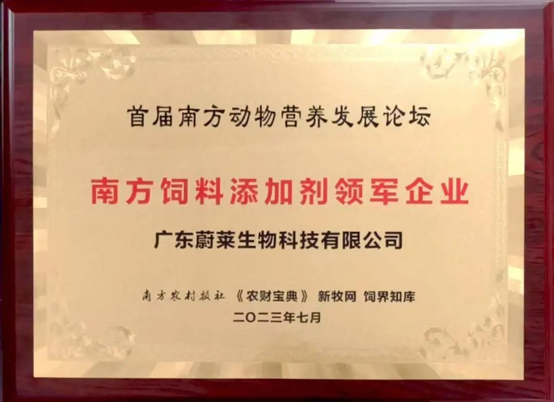 廣東蔚萊生物科技有限公司致力于安全、綠色、環(huán)保、高效的飼料添加劑的開發(fā)與應(yīng)用技術(shù)研究,已研發(fā)出蔚萊 1 號、蔚樂好、蔚樂壯、蔚常健、蔚常寧、蔚萊維為主導(dǎo)的多種畜禽、水產(chǎn)飼料添加劑,用自身實(shí)力贏得客戶的認(rèn)可和行業(yè)的肯定,榮獲2023首屆南方動(dòng)物營養(yǎng)發(fā)展論壇“南方飼料添加劑領(lǐng)軍企業(yè)”稱號。