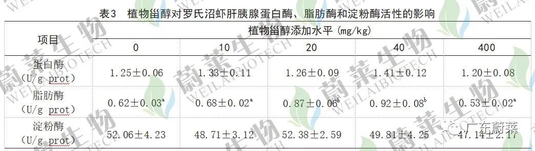 3.2 植物甾醇對(duì)羅氏沼蝦肝胰腺蛋白酶、脂肪酶和淀粉酶活性的影響