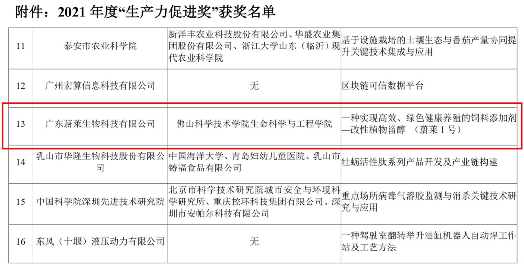 熱烈祝賀我司(廣東蔚萊生物科技有限公司)的拳頭產(chǎn)品“蔚萊1號”,因其具備高效促生長、明顯降低養(yǎng)殖成本和提高動物抗逆性等作用,助力養(yǎng)殖行業(yè)降本增效,榮獲2021年度中國“生產(chǎn)力促進獎”。