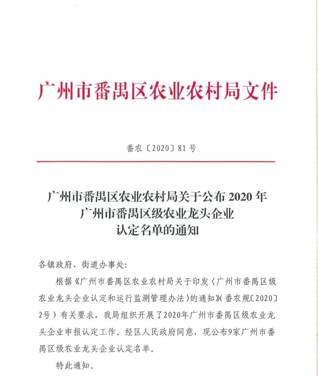 被評(píng)為廣州市番禺區(qū)農(nóng)業(yè)龍頭企業(yè)