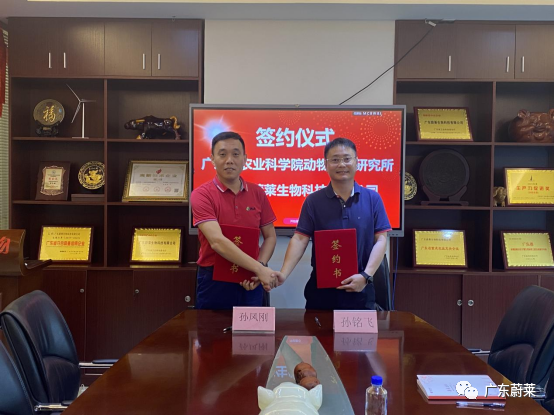 6月6日,于廣東蔚萊生物科技有限公司(以下簡(jiǎn)稱“廣東蔚萊”)總部中心會(huì)議室舉行了廣東蔚萊生物科技有限公司與廣東省農(nóng)業(yè)科學(xué)院動(dòng)物衛(wèi)生研究所(以下簡(jiǎn)稱“動(dòng)衛(wèi)所”)產(chǎn)學(xué)研合作簽約暨揭牌儀式 ,動(dòng)衛(wèi)所所長孫銘飛、主任魏光偉、副主任李娟,廣東蔚萊總經(jīng)理孫鳳剛、副總經(jīng)理潘忠超等出席座談會(huì)和簽約儀式。